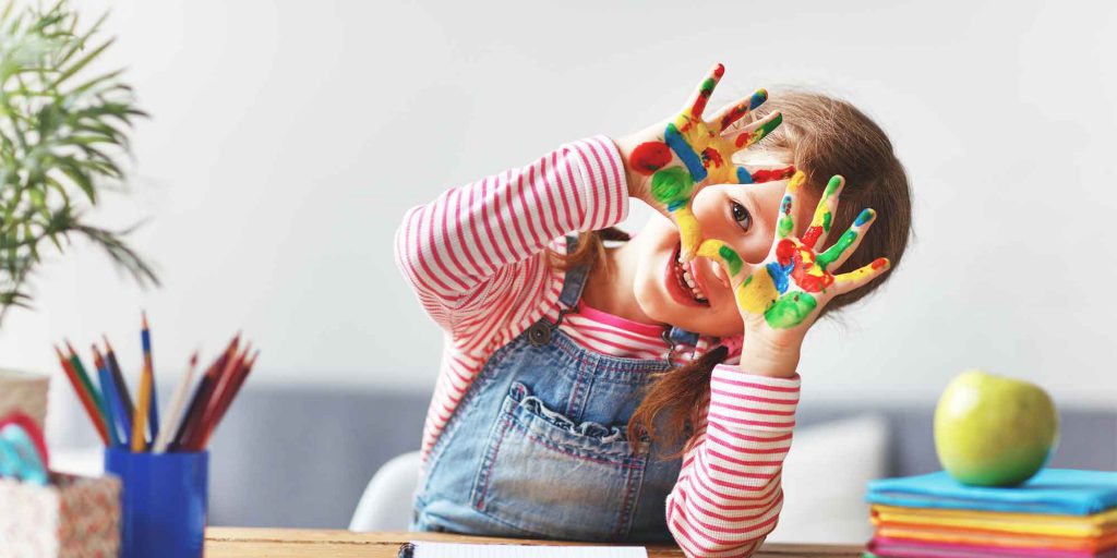 Lassen Sie Ihr Kind ein großformatiges Bild, gemalt mit echten Fingerfarben und der ganzen Hand (am besten im Freien), gestalten oder ein kleineres Bild nur aus Fingerabdrücken, gemacht mit einem Stempelkissen! Spaß und taktile Sensibilisierung kommen dabei nicht zu kurz.