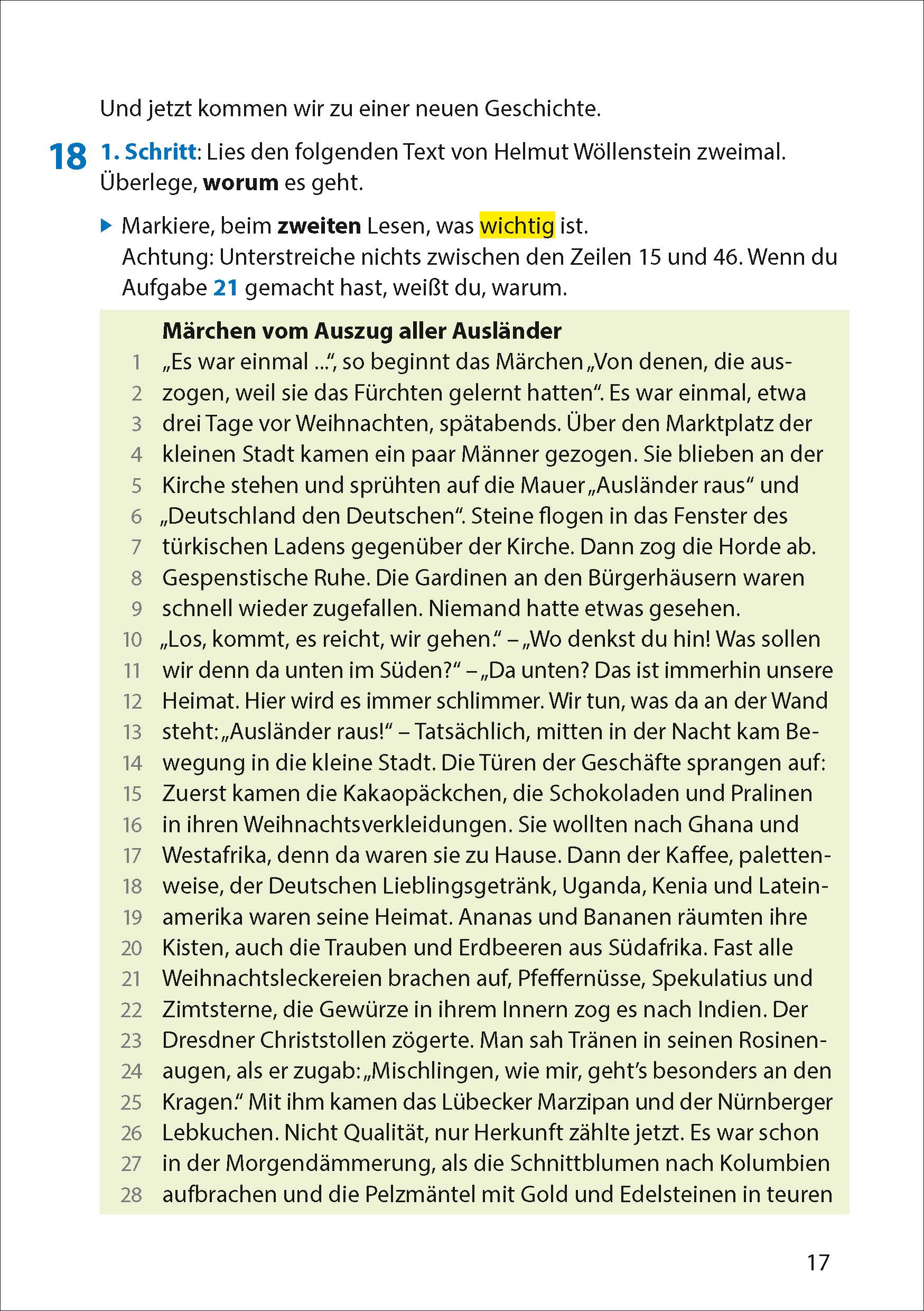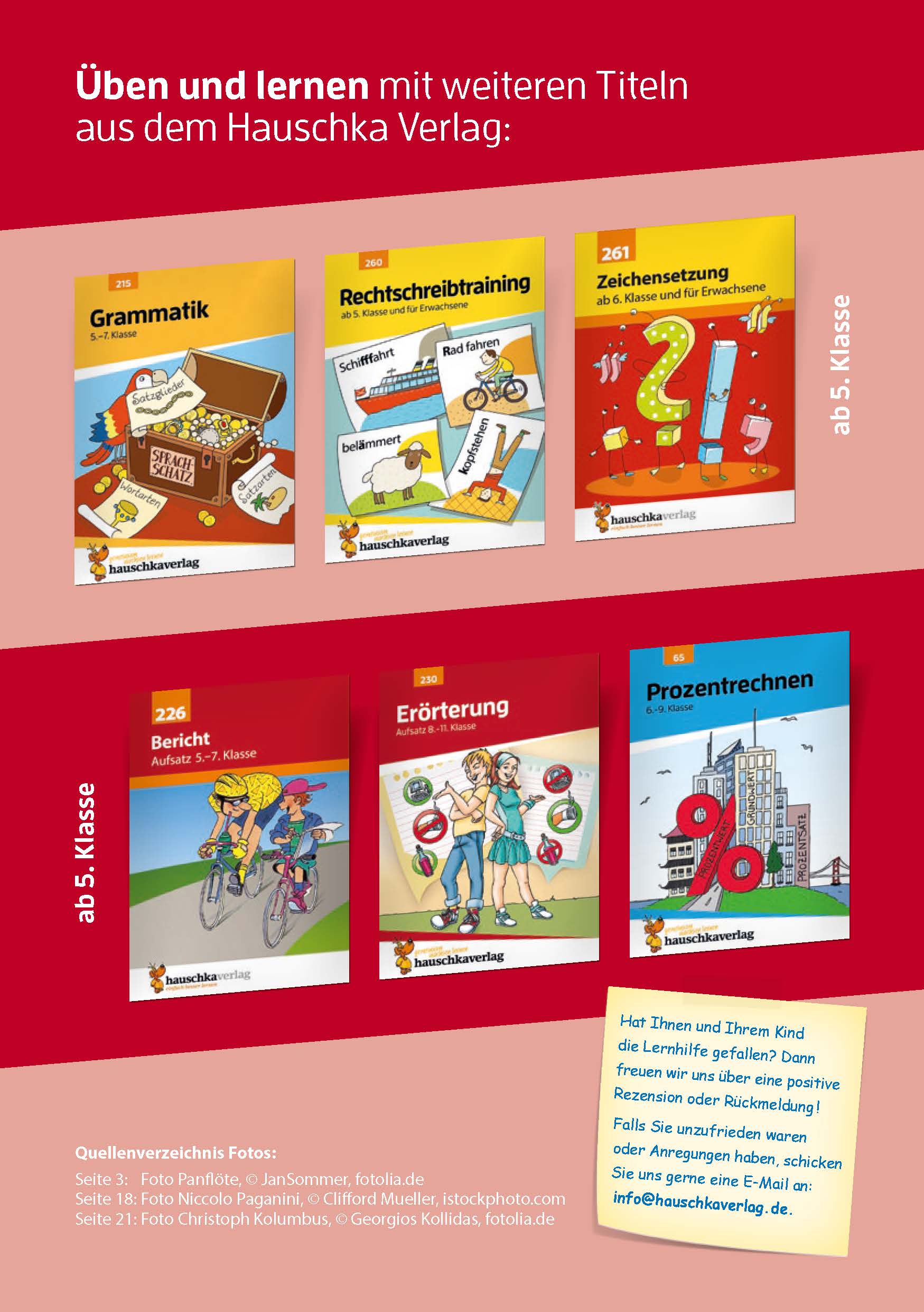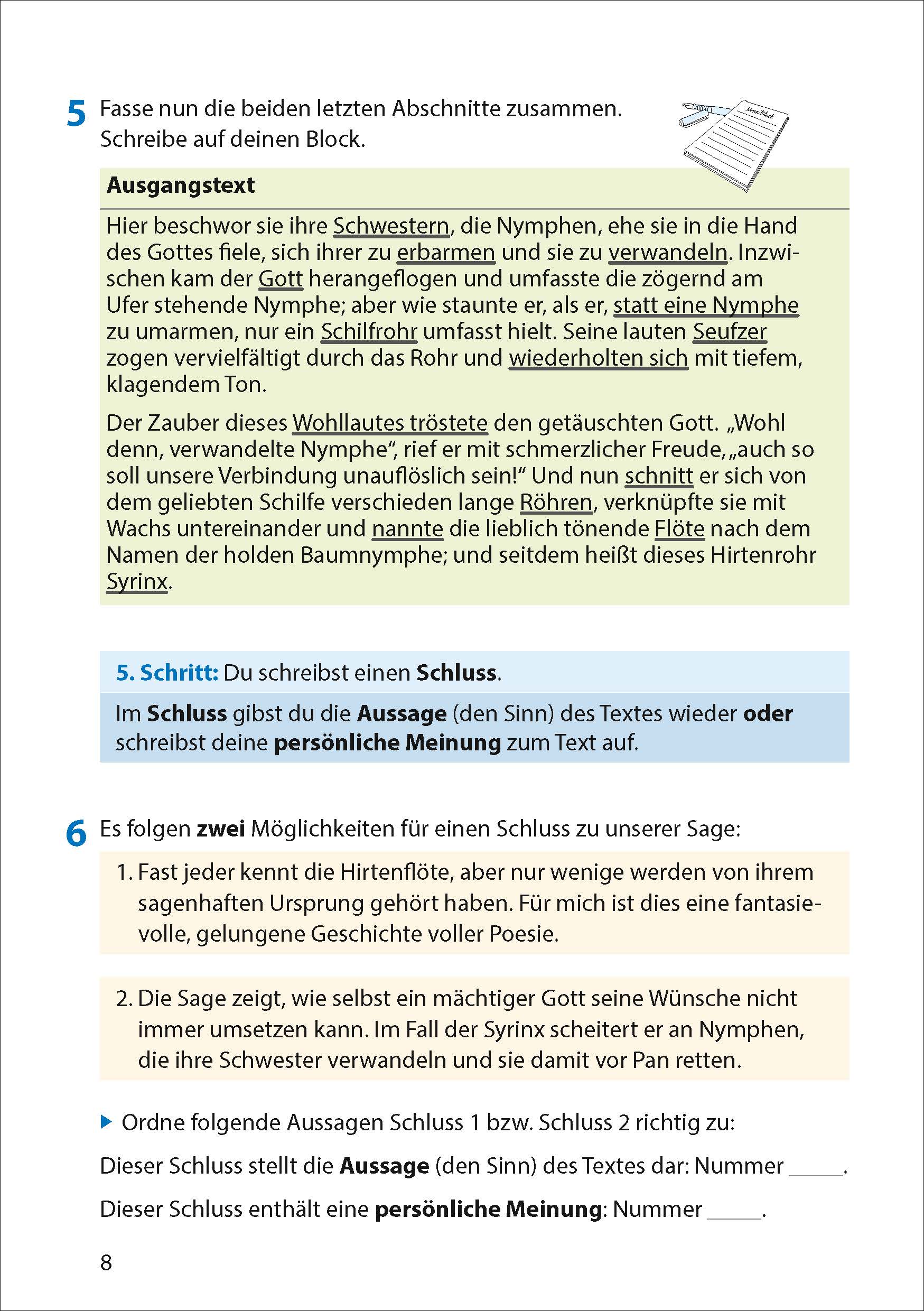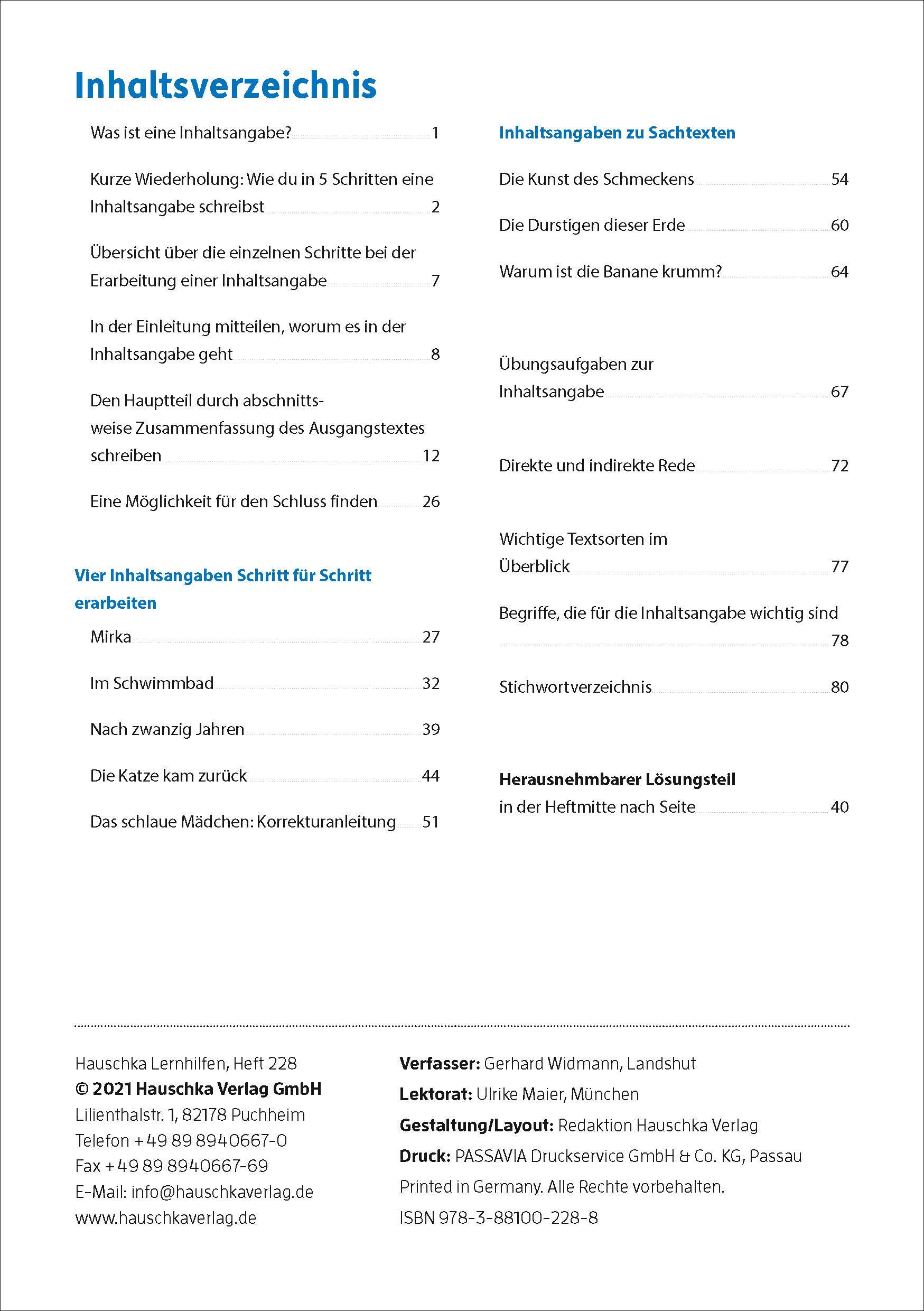 In fünf Schritten zur Inhaltsangabe: Anhand unterschiedlicher Texte wird das Erarbeiten einer Inhaltsangabe Schritt für Schritt geübt. Dabei werden sowohl verschiedene Textsorten (Erzählung, Romanausschnitt, Anekdote, Sachtext) berücksichtigt als auch unterschiedliche Schwierigkeitsgrade. Daher ist diese Lernhilfe von der 7. bis zur 9. Klasse einsetzbar. Viele abwechslungsreiche Übungen zur Erarbeitung von Einleitung, Hauptteil und Schluss sowie zur direkten und indirekten Rede erwarten die Schüler:innen. Ein Überblick über Textsorten und wichtige Begriffe als auch eine Übersicht über die Arbeitsschritte, die für das Verfassen einer Inhaltsangabe wichtig sind, erleichtern dabei das selbstständige und gezielte Arbeiten.