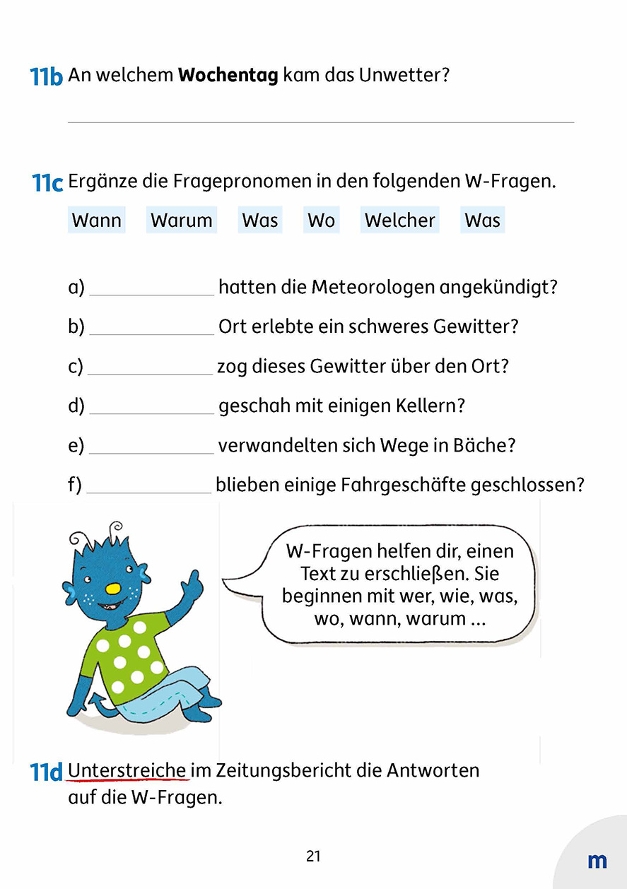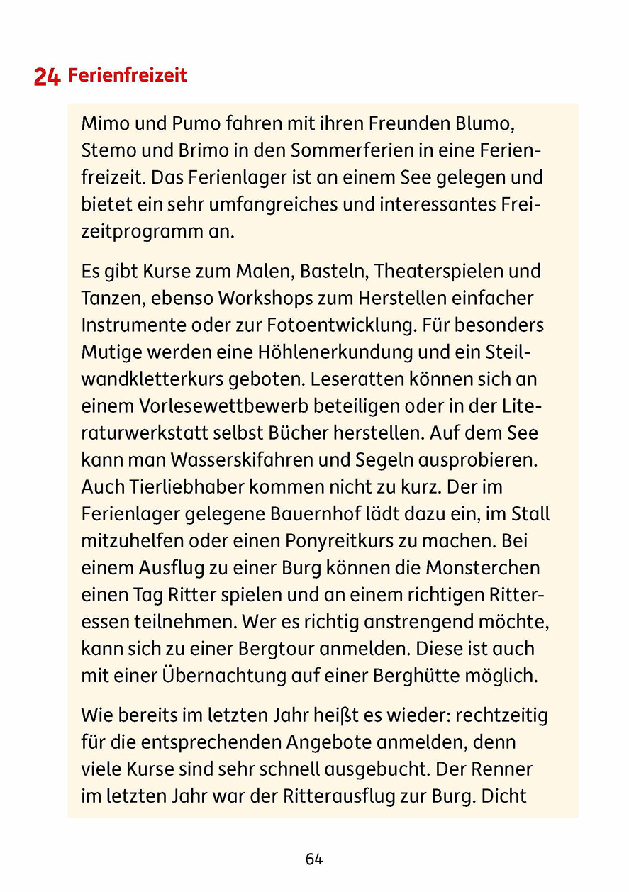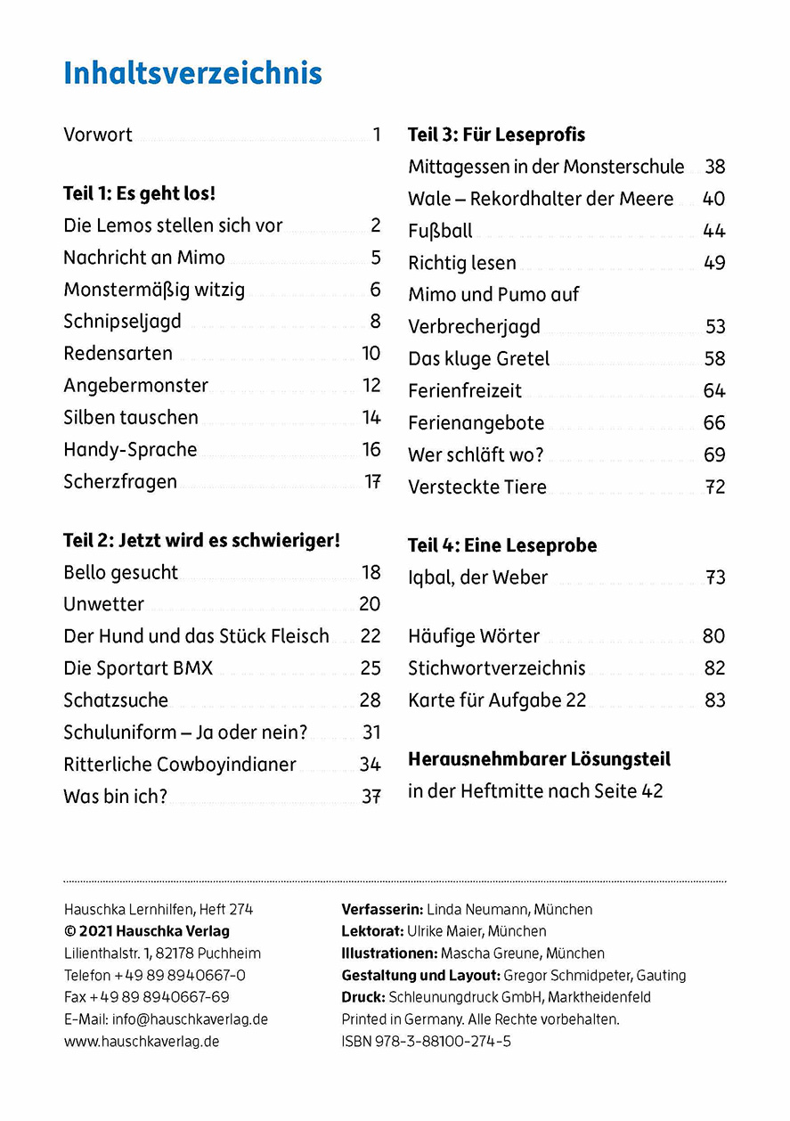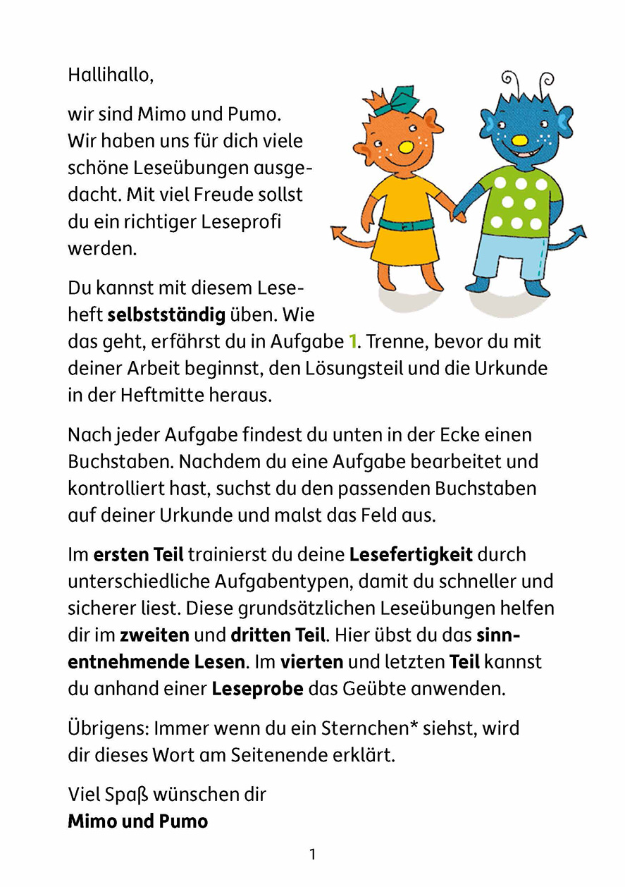 Lesen ist eine der Schlüsselkompetenzen für eine erfolgreiche und entspannte Schullaufbahn. Dabei geht es nicht nur darum, lesen zu können. Vor allem muss man auch verstehen, was man liest. Das Kind soll sich Texte erschließen können, sich eine eigene Meinung zu gelesenen Themen bilden, den Umgang mit verschiedenen Textsorten erlernen u. v. m. All dies wird in diesem Heft vermittelt und geübt. Den Schüler:innen stehen dabei die Lesemonster Mimo und Pumo zur Seite und helfen mit so manchem Tipp. Um die Motivation hochzuhalten, wartet in der Heftmitte eine Urkunde, die mit jeder erarbeiteten Übung wächst. Viele interessante Texte zu spannenden Themen begeistern Mädchen und Jungen gleichermaßen und regen zum selbstständigen und anhaltenden Lernen an.