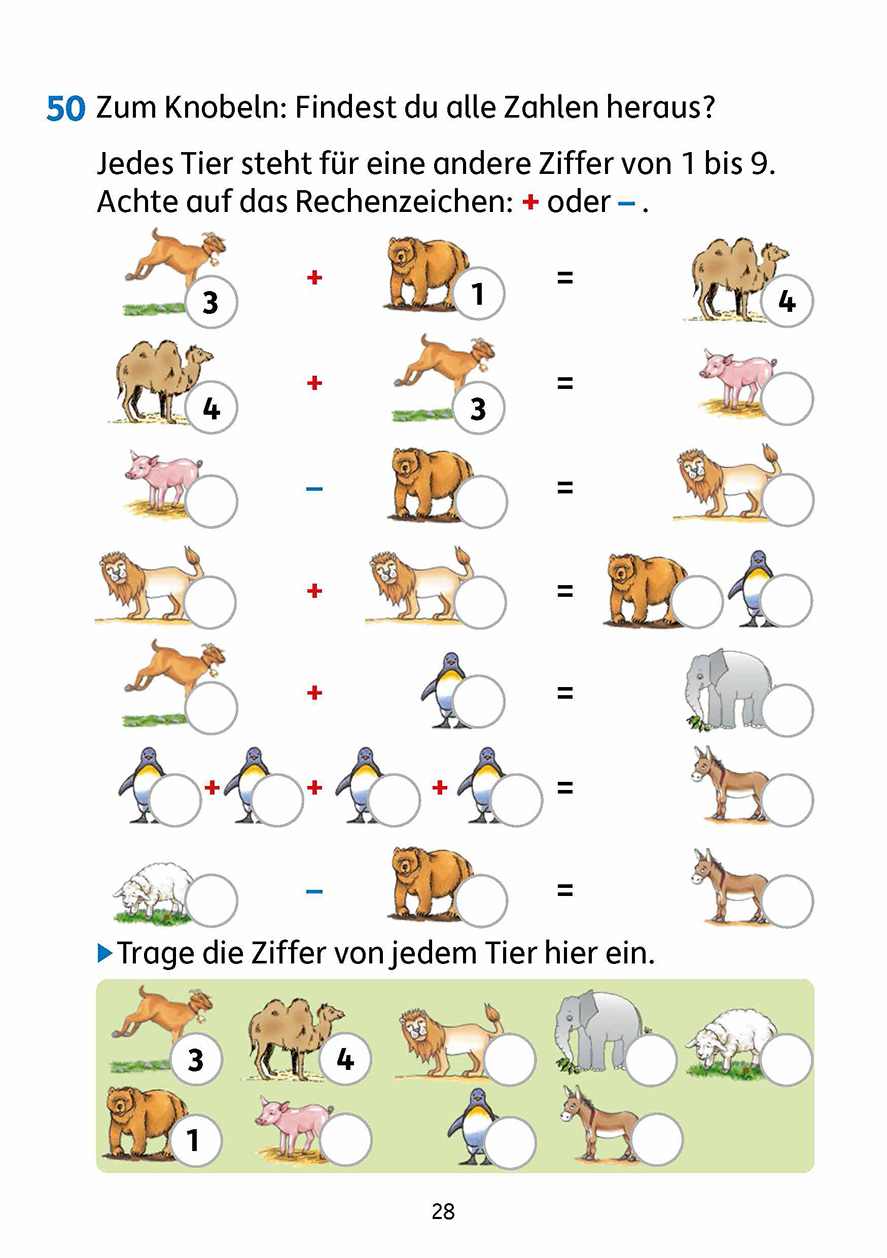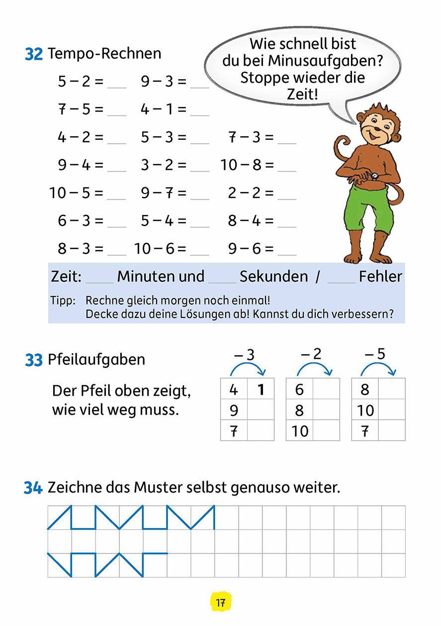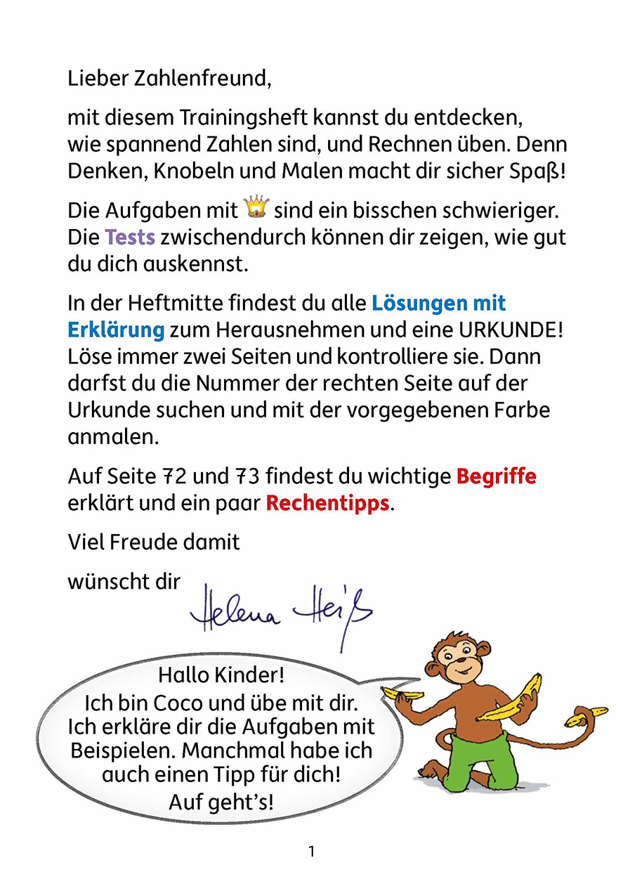 Coco, das kleine Äffchen, nimmt die Kinder der 1. Klasse mit hinein in die Welt der Mathematik. Zu Beginn werden Mengen gezählt und verglichen, Ziffern geschrieben und Begriffe der räumlichen Lage entdeckt. In überschaubaren Lernportionen rechnen die Kinder dann zunächst bis 10, bevor sie sich den Zahlenraum bis 20 erschließen und auch hier Aufgaben lösen. Neben reinen Rechenfertigkeiten können die Schüler mit diesem Heft auch erste Sachaufgaben bearbeiten und sich mit geometrischen Formen auseinandersetzen. Das Lesen der Uhr und das erste Rechnen mit Zeiten runden das Heft ab: Somit sind alle wichtigen Bereiche des Lehrplans für die erste Klasse abgedeckt. Kurz: Es wird viel trainiert, aber der Spaß kommt nicht zu kurz, denn spielerische, rätselhafte und abwechslungsreiche Aufgabenarten, begleitet von dem Äffchen Coco, lassen Mathematik spannend werden.