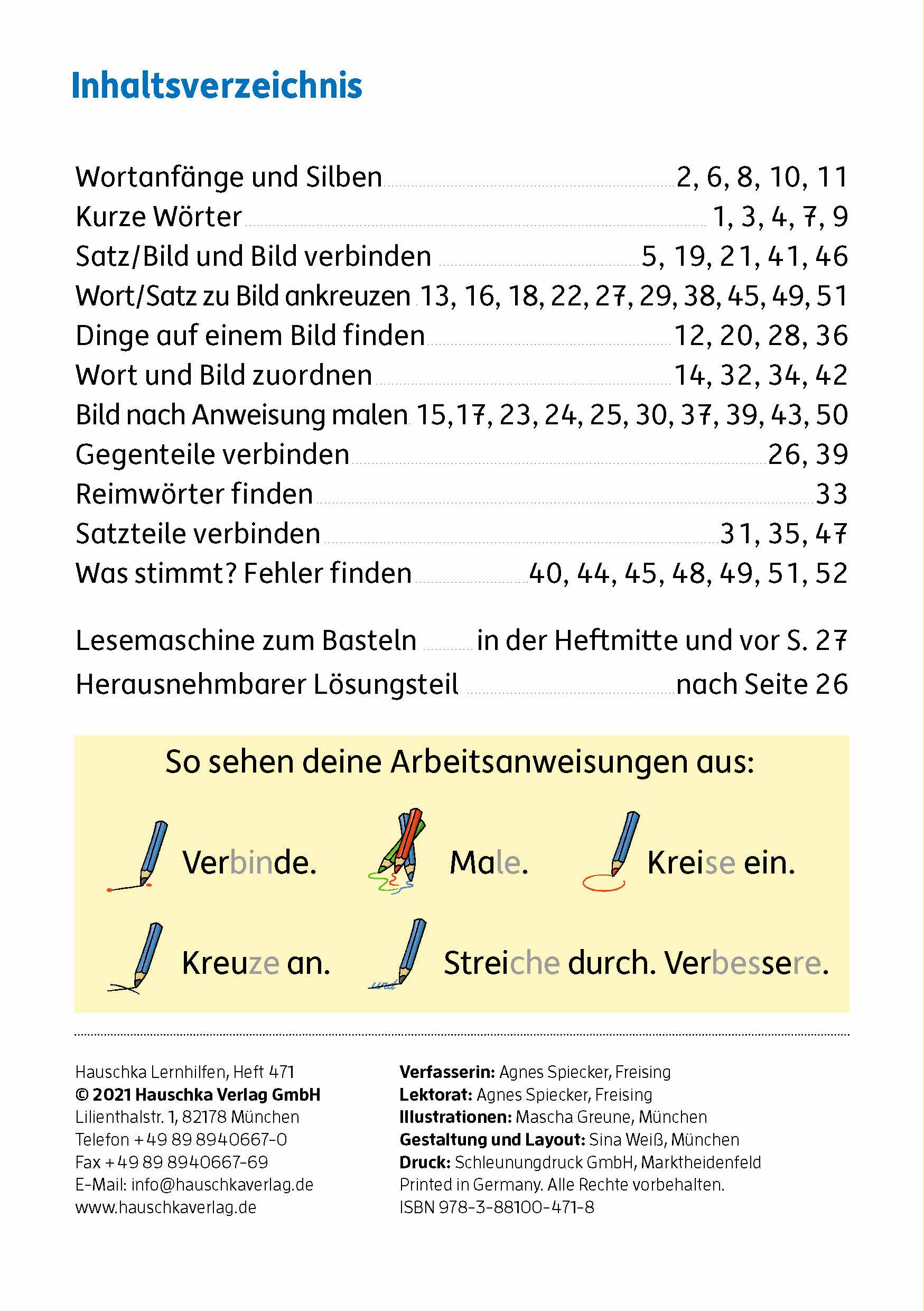 Wiederholung und Training gehören zum Lernen einfach dazu, denn nur die Übung macht die/den Meister:in. In diesem Heft finden die Kinder einfach verständliche Aufgaben mit liebevoll gestalteten Illustrationen. Gut strukturierte Übungen und ein sich in der Schwierigkeit steigernder Aufbau ermöglichen es den Schulanfängerinnen und Schulanfängern sich Schritt für Schritt das Lesen zu erschließen: von Silben und kurzen Wörtern bis zu längeren Wörtern, Lautkombinationen und einfachen Sätzen. Die Silbengliederung der Wörter ist dabei eine gute zusätzliche Unterstützung. Mit dem Heft können die Kinder selbstständig üben und ihre Lesekompetenz vertiefen und steigern. Das Training lässt sie sicherer werden, sodass sie auch mit den schulischen Herausforderungen zurechtkommen und das Lesen bald zu einem Abenteuer werden kann. Mit dabei ist eine Bastelvorlage für eine kleine „Lesemaschine“. Ein herausnehmbarer Lösungsteil bietet die Möglichkeit zur Selbstkontrolle. Zu diesem Übungsheft gibt es einen weiteren Band: Mein Übungsheft Lesen, 1. Klasse: Vom Satz zum Text.