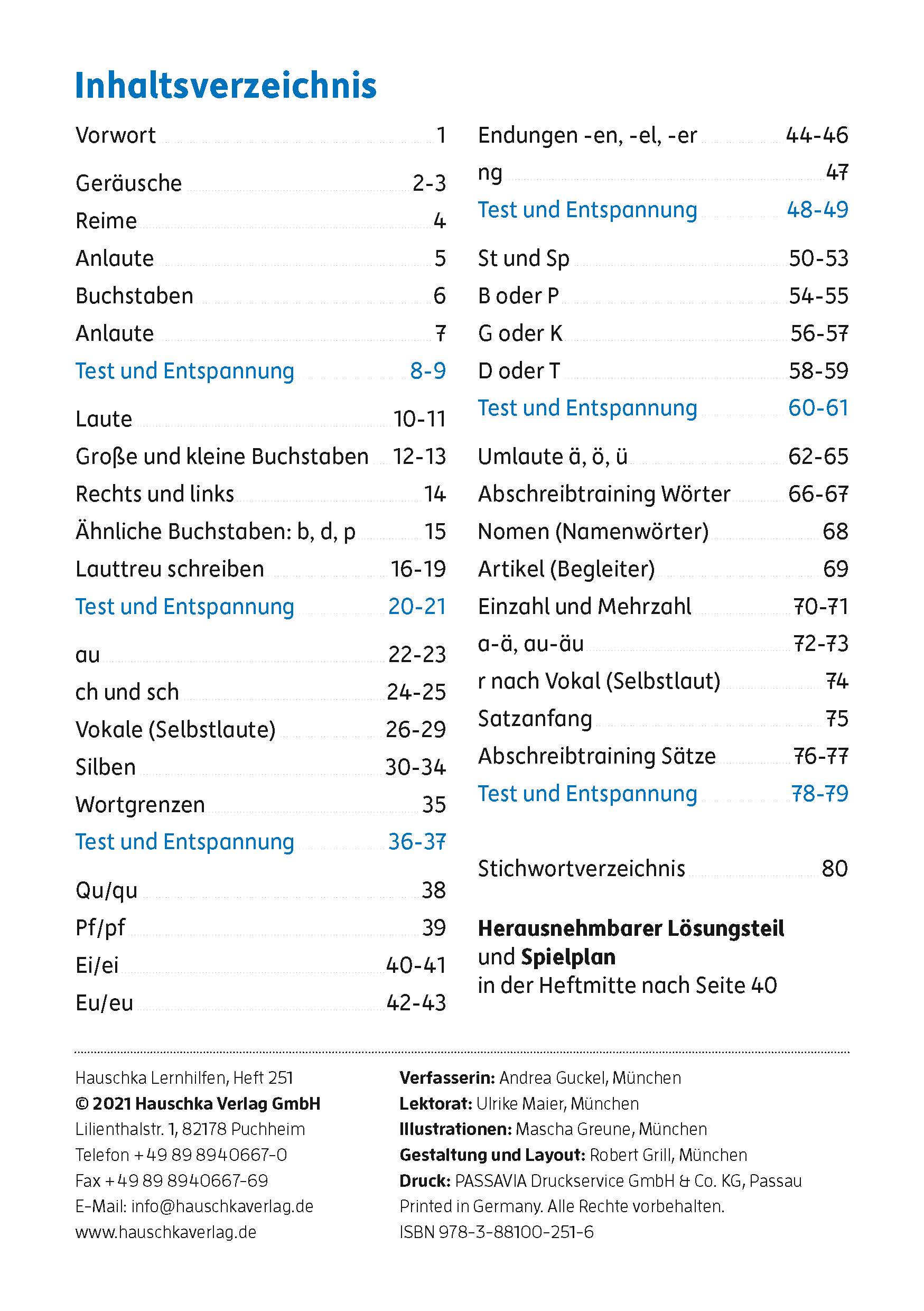 Das lustige Eichhörnchen Molli hilft den Kindern, das richtige Schreiben zu üben. Das Heft beginnt mit Übungen zu Lauten, Selbstlauten und Silben, danach folgen bestimmte rechtschriftliche Schwierigkeiten wie Qu/qu, St/st u. ä. Nach jedem Abschnitt können die Kinder prüfen, ob sie das jeweilige Lernziel erreicht haben. Danach folgt als Belohnung eine Entspannungsseite mit kleinen Rätseln oder Malaufgaben. Der herausnehmbare Lösungsteil unterstützt die Kinder bei ihrer selbstständigen Arbeit.