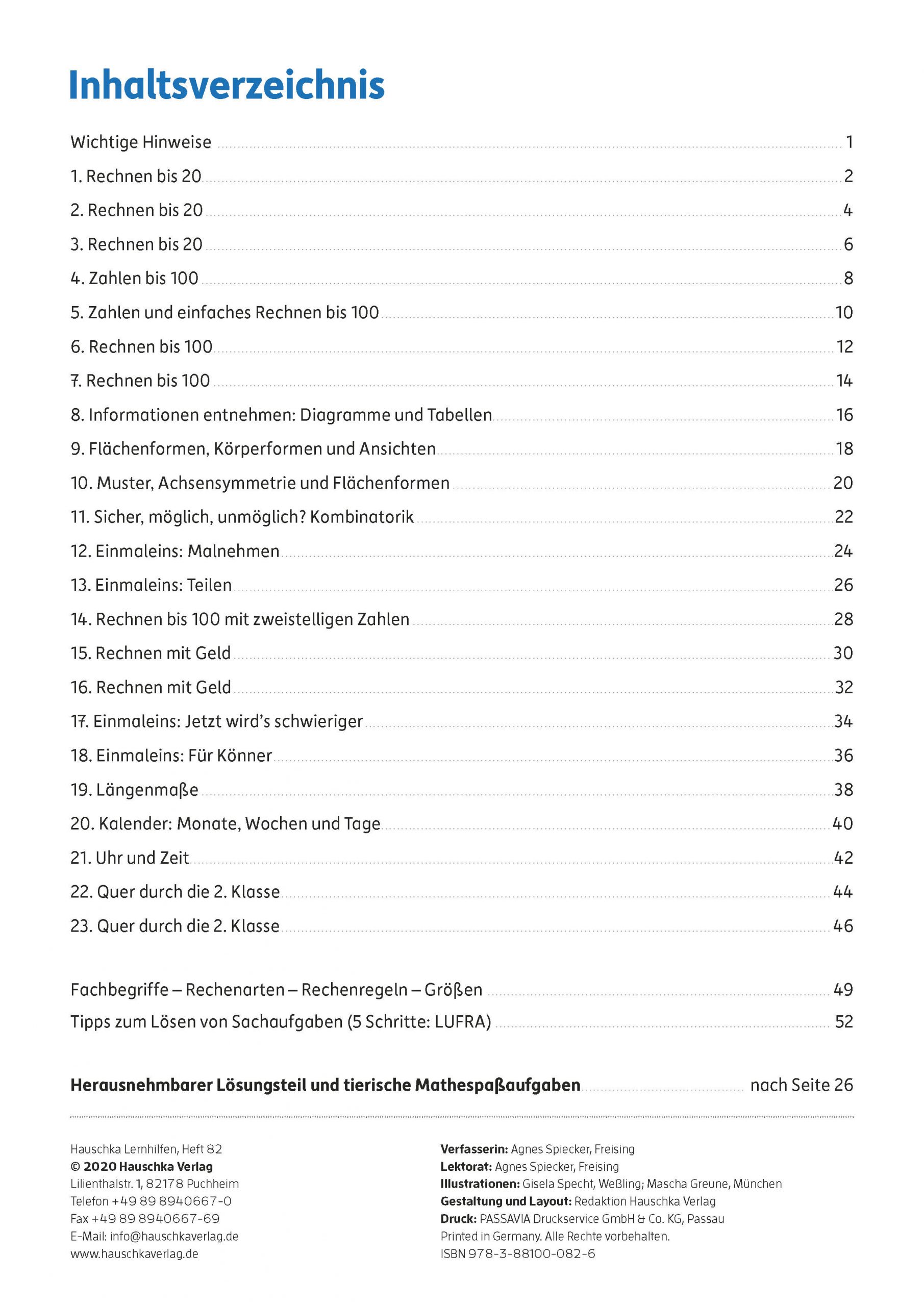 Tests begleiten den Schulalltag der Kinder: Hier können sie zeigen, was sie gelernt haben. Um sich darauf vorzubereiten, ist es eine gute Hilfe, einen Übungstest vorher zu Hause auszuprobieren. Mit diesem Heft werden alle Themen des Mathelehrplans abgedeckt und die Tests einzelnen Lernbereichen zugeordnet, sodass sich leicht ein passender Übungstest finden lässt. Die Aufgaben sind abwechslungsreich und kindgemäß. Sie stärken Rechenfertigkeiten im Zahlenraum bis 100, üben Text- und Sachaufgaben, trainieren den Umgang mit Größen (Geld, Längen und Zeiten) und behandeln Fragen zu Flächen- und Körperformen, Wahrscheinlichkeit und Kombinatorik. Mit Hilfe des Lösungsteils können die Ergebnisse verbessert und bewertet werden. Eine Note lässt sich berechnen. Die Kinder können so gut einschätzen, was sie schon sicher beherrschen oder in welchen Bereichen sie für die Klassenarbeit in der Schule noch üben sollten.