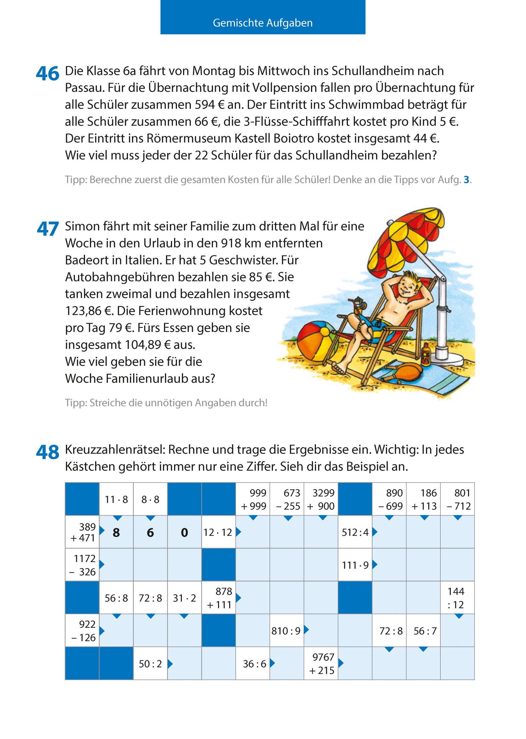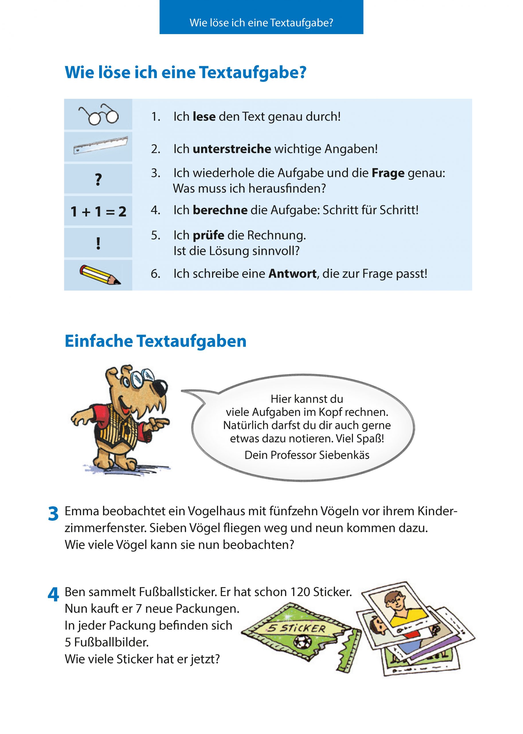 Wenn es bei Textaufgaben Lücken gibt, ist dieses Heft die perfekte Ergänzung zum Unterricht und den Hausaufgaben. Hier finden die Schüler:innen zu verschiedenen Bereichen Text- und Sachaufgaben, die sich stetig in ihrer Schwierigkeit steigern. In ansprechende und abwechslungsreiche Aufgaben verpackt werden viele Bereiche des Lehrplans geübt: Natürliche Zahlen, Grundrechenarten, Terme, Umgang mit Diagrammen und das Rechnen mit Größen. So können sich die Schüler:innen gut auf anstehende Tests oder den Übertritt auf eine weiterführende Schule vorbereiten. Im herausnehmbaren Lösungsteil gibt es vollständige und zum Teil anschaulich dargestellte Lösungswege, sodass jede:r selbstständig seine Rechenwege nachvollziehen und überprüfen kann.
