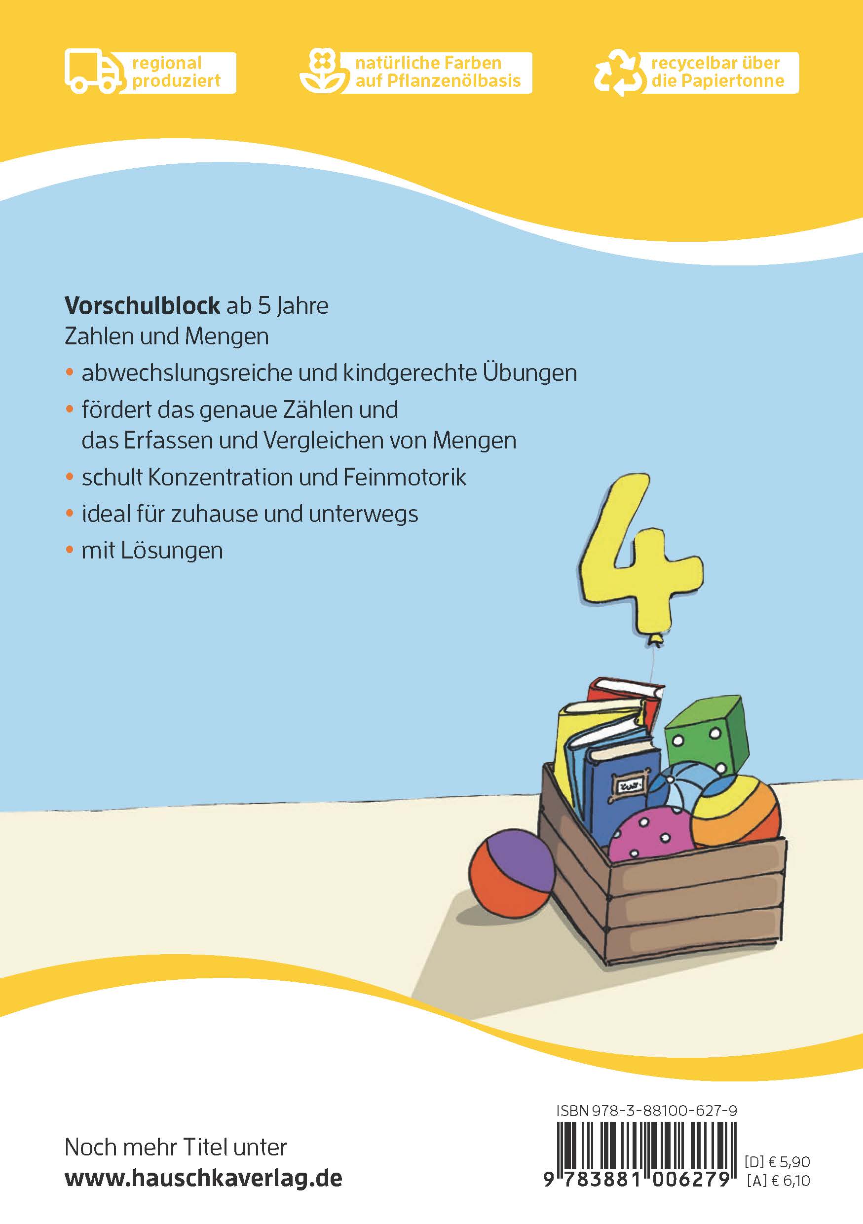 In diesem Block entdecken die Kinder spielerisch die Zahlen von 1-10. Es kann fleißig gezählt, kombiniert und verglichen werden. Die Kinder entwickeln ein Verständnis für Mengen und Größen und schulen so ganz ohne Druck ihre mathematischen Fähigkeiten. Ganz nebenbei werden aber auch Konzentration, genaues Hinsehen und Feinmotorik gefördert. So kann der Schulstart kommen! Durch das handliche Format ist der Block der ideale Begleiter für zuhause und unterwegs!