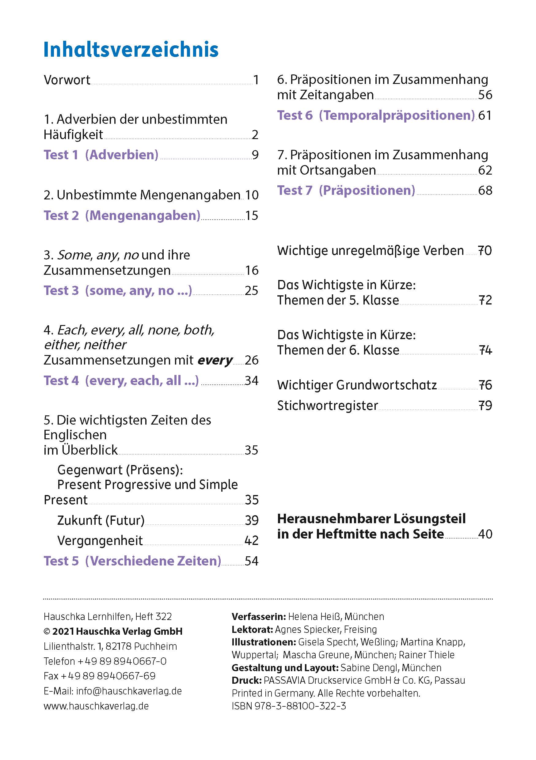 Beim Erlernen einer Sprache bereitet deren Grammatik häufig Schwierigkeiten, da diese meist große Unterschiede zur eigenen Muttersprache aufweist. Diese Lernhilfe beinhaltet die wichtigsten Grammatikbereiche des 2. Englischjahres. Die wichtigsten Regeln und Besonderheiten werden wiederholt und mit Hilfe von gut verständlichen Aufgaben eingeübt. Durch den klaren Aufbau, das schrittweise Vorgehen und die genau erklärten Übungen eignet sich dieses Heft besonders auch für schwächere Schüler:innen. Verschiedene Tests geben Rückmeldung über den Lernerfolg und motivieren zusätzlich.